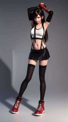 best quality,masterpiece,realistic,3D graphics,1girl,tifa lockhart,solo,thighhighs,skirt,suspenders,long hair,crop top,gloves,red footwear,suspender skirt,black thighhighs,fingerless gloves,full body,**** top,black skirt,midriff,navel,elbow gloves,boots,black hair,white **** top,clenched hands,brown eyes,brown hair,full body,red eyes,<lora:MIAOKA_tifa:0.8>,arms up,