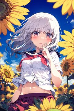 1girl,flower,solo,skirt,sunflower,white hair,shirt,yellow flower,looking at viewer,short sleeves,school uniform,neckerchief,white shirt,long hair,navel,red flower,red eyes,red neckerchief,bangs,blush,pleated skirt,serafuku,blue skirt,sailor collar,midriff,blue flower,blurry,floating hair,outdoors,hand up,covering mouth,