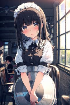 tray,blush,solo focus,holding tray,maid headdress,brown eyes,black hair,parted lips,multiple girls,looking at viewer,maid,dress,bangs,indoors,black dress,short sleeves,holding,blurry,depth of field,window,blurry background,long hair,apron,puffy sleeves,3girls,day,puffy short sleeves,wrist cuffs,collared dress,waitress,head tilt,sunlight,standing,chair,frills,shirt,sailor collar,(detailed eyes:1.5),