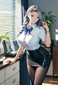 (masterpiece),(best quality),highres,incredibly absurdres,absurdres,very_high resolution,original,intricate details,hyper detail,ultra-detailed,exquisite detailed,extremely delicate,illustration,chromatic aberration,film grain,cinematic,bokeh,caustics,emphasis lines,extremely detailed CG,unity 8k wallpaper,game cg,(1girl),(solo),solo_focus,shiny hair,glossy hair,parted bangs,wavy hair,long hair,disheveled_hair,hair behind ear,blue eyes,sharp_eyelid,eyeliner,eyelashes,eyeshadow,mature female,milf,(perfect detailed face),lips,(lipgloss),glossy skin,(shiny skin)feminine proportions,skinny,toned,narrow waist,slim,wide hips,curvy,large_breasts,perky_breasts,portrait,cowboy shot,pov,pantyhose,braid,leaning forward,black pantyhose,smile,grey hair,earrings,jewelry,french braid,bangs,skirt,pencil skirt,office lady,formal,high heels,short sleeves,hair bow,blue bow,collared dress,black business suit,(detailed beautiful scene),scenery,landscape,indoors,(office),plant,table,window,curtains,sunlight,<lora:yukiyoshi mamizu-03:0.8>,yukiyoshi mamizu,