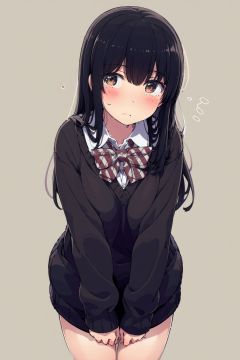 1girl, solo, pantyhose, skirt, long hair, loafers, shoes, simple background, school uniform, brown eyes, plaid, black pantyhose, plaid skirt, looking at viewer, black hair, pantyhose pull, full body, clothes pull, black footwear, pleated skirt, leaning forward, bangs, long sleeves, bent over, cardigan, bow, bowtie, standing, closed mouth, pulled by self, grey background, blush, miniskirt, red bow, sweater, **********