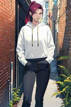 (masterpiece),(best quality),highres,incredibly absurdres,absurdres,very_high resolution,original,intricate details,hyper detail,ultra-detailed,exquisite detailed,extremely delicate,illustration,chromatic aberration,film grain,cinematic,bokeh,caustics,emphasis lines,extremely detailed CG,unity 8k wallpaper,flat color,sketch,(1girl),shiny hair,glossy hair,sharp_eyelid,eyeliner,eyelashes,eyeshadow,tall female,mature female,*******,perfect detailed face,lips,(lipgloss),feminine proportions,skinny,toned,slim,wide hips,curvy,large_breasts,perky_breasts,shiny skin,glossy skin,(long legs),cropped legs,cowboy shot,knee,(detailed beautiful scene),scenery,landscape,bloom,picturesque,UHD wallpaper,HDR,global illumination,volumetric light,wavy hair,forehead,parted bangs,black hair,multicolored hair,gradient hair,red hair,hair behind ear,low ponytail,ponytail,purple eyes,smile,light smile,(black_pants),(grey_hoodie),long sleeves,(zipper),sunlight,nature,street,window,plant,brick wall,(vines),(alley),depth of field,(hands in pockets),<lora:yukiyoshi mamizu-03:0.8>, yukiyoshi mamizu,sketch,flat color,