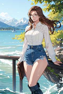 (masterpiece),(best quality),highres,incredibly absurdres,absurdres,very_high resolution,original,intricate details,hyper detail,ultra-detailed,exquisite detailed,extremely delicate,illustration,chromatic aberration,film grain,cinematic,bokeh,caustics,emphasis lines,extremely detailed CG,unity 8k wallpaper,(1girl),shiny hair,glossy hair,sharp_eyelid,eyeliner,eyelashes,eyeshadow,tall female,mature female,*******,perfect detailed face,lips,(lipgloss),feminine proportions,skinny,toned,slim,wide hips,curvy,large_breasts,perky_breasts,shiny skin,glossy skin,(long legs),cropped legs,cowboy shot,knee,(detailed beautiful scene),scenery,landscape,bloom,picturesque,UHD wallpaper,HDR,global illumination,volumetric light,wavy hair,forehead,parted bangs,lateral view,long hair,hair behind ear,brown hair,(floating hair:1.2),green eyes,smile,light smile,grin,jeans,buttons,long sleeves,white blouse,earrings,knee boots,black footwear,smartwatch,flower,sunlight,park,plant,nature,outdoors,lake,pavement,mountainous horizon,clear sky,motion blur,waves,tree,<lora:细边圆框眼镜thinRoundGlasses_v11:0.6>,(round eyewear),glasses,circle-glasses,<lora:yukiyoshi mamizu-03:0.8>, yukiyoshi mamizu,sketch,flat color,