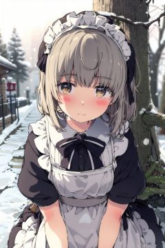 1girl, maid headdress, solo, weapon, gun, gloves, apron, holding, maid, brown hair, tree, short hair, holding weapon, holding gun, black gloves, rifle, jacket, snow, maid apron, outdoors, dress, white jacket, snowing, brown eyes, yellow eyes, closed mouth, bow, long sleeves, white bow, bowtie, bangs, ribbon, black dress, bare tree, expressionless, coat, looking away, white apron,(detailed eyes:1.5),