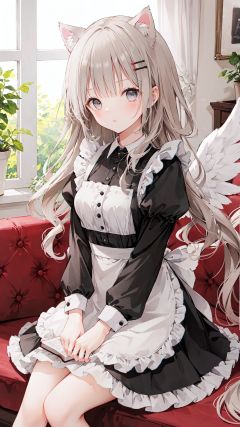 multiple girls,2girls,apron,feathered wings,wings,maid,indoors,long hair,juliet sleeves,brown eyes,dress,white wings,maid headdress,animal ears,puffy sleeves,long sleeves,white apron,black dress,sitting,hair ornament,bangs,maid apron,hairclip,window,angel wings,sunlight,head tilt,frilled apron,ribbon,grey eyes,looking at viewer,book,closed mouth,grey hair,frills,black nails,breasts,brown hair,very long hair,holding,blush,cat ears,parted lips,