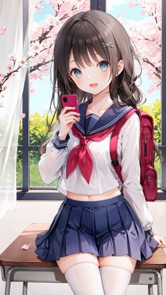 skirt, school uniform, thighhighs, sitting, multiple girls, serafuku, petals, open mouth, shirt, desk, holding, white shirt, bag, phone, cherry blossoms, long hair, pleated skirt, long sleeves, solo focus, chair, curtains, school desk, window, sailor collar, smile, indoors, cellphone, 2girls, brown hair, neckerchief, classroom, blue skirt, bangs, blue eyes, blush, :d, smartphone, zettai ryouiki, day, midriff peek, school chair, black skirt, tree, pencil case, backpack, book, holding phone, black hair, green eyes, blue sailor collar, white thighhighs, hand up