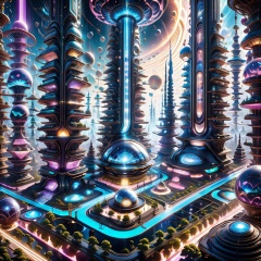 Behold the mind-bending vista from above as you hover over the 8K representation of a Sci-Fi Megalopolis Planet, an intergalactic labyrinth where advanced technology and bizarre extraterrestrial life forms engage in a bewildering, yet captivating spectacle, weaving a surreal tapestry of pulsating lights and the enigmatic rhythms of their cosmic harmonies. From this aerial perspective, the colossal city that spans the entire planet's surface unveils itself, revealing skyscrapers that defy gravity and holographic streets that form intricate patterns. The eccentric cityscape seems to shift and undulate, akin to a living organism, and the planet's surface itself appears to pulsate with an avant-garde flair, creating an immersive experience that challenges the boundaries of space and time. This alien world leaves no room for the ordinary, ensuring that you witness an otherworldly realm filled with paradox and wonder from above. The neon-lit pathways twist and contort like neural connections, structures that seem to defy the laws of physics create an illusion of perpetual motion, gardens that flourish in surreal patterns resemble bioluminescent fractals, and the inexplicable geometries of their cascading waterfalls transport you to a mind-bending dimension of cosmic chaos