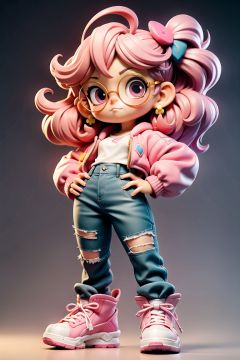 Pixar style,MG_ip,1girl,solo,pink hair,glasses,denim,jeans,jewelry,torn pants,shoes,pants,long hair,hands on hips,torn clothes,pink jacket,earrings,jacket,round eyewear,torn jeans,looking at viewer,sneakers,full body,ring,hair ornament,pink eyes,blush,ahoge,standing,shirt,pink footwear,closed mouth,bow,(fluffy:1.3),