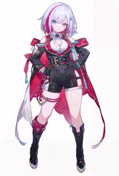 8k, best quality, masterpiece, (ultra-detailed:1.1), (high detailed skin), (full body:1.2), white background, standing, looking at viewer, solo, hand on hip, <lora:tuopa-v100:0.8:lbw=OUTALL>, tuopa, black gloves, black footwear, multicolored hair, shorts, streaked hair, blue eyes, single thigh strap, (white background, simple background,:1.2), <lora:EnvyBetterHands LoCon_beta2 辅助:0.55>, ( good hands, nice hands:0.5), (beautiful_face), ((intricate_detail)), clear face, ((finely_detailed)), fine_fabric_emphasis, ((glossy)), full_shot,