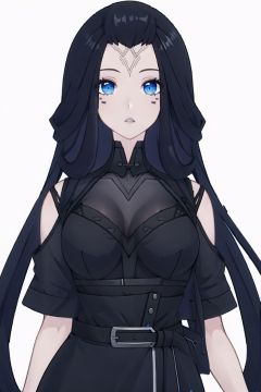 1girl, solo, blue eyes, black hair, breasts, long hair,  looking at viewer, facial mark, parted lips, belt, large breasts,black dress,nanyinXF,