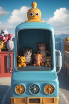 masterpiece,best quality,c4dchangjing\(c4d\),cloud,sky,no humans,outdoors,ground vehicle,day,blue sky,train,motor vehicle,blurry,cloudy sky,bear,open mouth,dog,looking at viewer,smile,food,building,stuffed toy,car,bus,bird,black eyes,hat,solo,objectification,fruit,monokuma,artist name,stuffed animal,railroad tracks,window,blurry background,<lora:c4dchangjing-000010:0.65>,