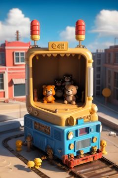 masterpiece,best quality,c4dchangjing\(c4d\), cloud, sky, no humans, outdoors, ground vehicle, day, blue sky, train, motor vehicle, blurry, cloudy sky, bear, open mouth, dog, looking at viewer, smile, food, building, stuffed toy, car, bus, bird, black eyes, hat, solo, objectification, fruit, monokuma, artist name, stuffed animal, railroad tracks, window, blurry background,<lora:c4dchangjing-000010:0.65>,