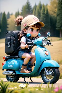 Pixar style,MG ip,1girl,ground vehicle,motor vehicle,outdoors,shorts,brown hair,brown eyes,scooter,solo,child,bag,hat,long hair,short sleeves,shirt,flower,backpack,depth of field,blurry background,sitting,grass,smile,shoes,day,boots,closed mouth,cross-laced footwear,tree,helmet,blue shorts,