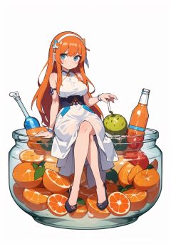 (white background:1.45),(transparent background:1.3)(an extremely delicate and beautiful girl inside of glass jar:1.2), (glass jar:1.35),(solo:1.2), (full body), (beautiful detailed eyes, beautiful detailed face:1.3), (sitting ), (very long silky hair, float white hair:1.15), (medium_breasts, tally and skinny:1.2), (Colorful dress:1.3), (extremely detailed lace:0.3), (insanely detailed frills:0.3),(hairband , orange hair_ornament:1.25),(bottle filled with orange water,bottle filled with Fanta:1.25), (many fruits in jar, many Sliced_fruits in jar:1.25), (many bubbles:1.25),