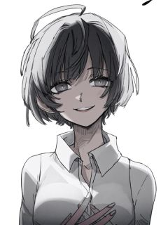 best quality,llustration,1girl, upper body, solo, smile, ahoge, grey eyes, short hair, eyebrows visible through hair, bangs, looking at viewer, white shirt, shirt, greyscale, monochrome, simple background, white background,<lora:Helltaker:0.5>
