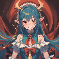 best quality,llustration,nia teppelin,1girl, elf, upper body, pointy ears, solo, looking at viewer, blush, long hair, bangs, red eyes, grin, smile, blue hair, red bow, earrings, jewelry, dress, off shoulder