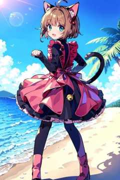 (masterpiece:1.2), best quality, ultra high resolution, unity 8k wallpaper, (illustration:1.0), (beautiful detailed eyes:1.6), extremely detailed face, perfect lighting, extremely detailed CG, (perfect hands,perfect anatomy), (dynamic angle and pose:1.3), nice angle, (1girl, solo:1.5), BREAKkinomoto sakura, green eyes, brown hair, short hair, antenna hair, BREAKfake animal ears, animal ears, cat ears, tail, cat tail, dress, black dress, long sleeves, pink dress, apron, pink apron, bell, open mouth, pantyhose, black pantyhose, jingle bell, boots, pink footwear, BREAKkero, BREAKsmile, paw pose, open mouth, BREAK(palm tree:1.3), (ocean:1.3), (outdoors:1.2), (sky:1.2), (beach:1.4), (ass focus, hip focus, :1.3),(medium full shot:1.4),