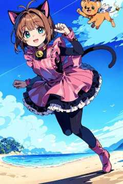 (masterpiece:1.2), best quality, ultra high resolution, unity 8k wallpaper, (illustration:1.0), (beautiful detailed eyes:1.6), extremely detailed face, perfect lighting, extremely detailed CG, (perfect hands,perfect anatomy), (dynamic angle and pose:1.3), nice angle, (1girl, solo:1.5), BREAKkinomoto sakura, green eyes, brown hair, short hair, antenna hair, BREAKfake animal ears, animal ears, cat ears, tail, cat tail, dress, black dress, long sleeves, pink dress, apron, pink apron, bell, open mouth, pantyhose, black pantyhose, jingle bell, boots, pink footwear, BREAKkero, BREAKsmile, paw pose, open mouth, BREAK(palm tree:1.3), (ocean:1.3), (outdoors:1.2), (sky:1.2), (beach:1.4), (walking:1.3),(medium full shot:1.4),(raising one hand:1.4),