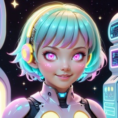 kawaiitech aesthetics, scifi kawaiitech scholar female with a pixie cut, glowing eyes, light smile, closed mouth, from a scifi futuristic kawaiitech world, cute pastel colors and symbols, glowing parts, ((best quality)), ((masterpiece)), ((realistic, digital art)), (hyper detailed), raytracing, volumetric lighting, Backlit, Rim Lighting, HDR, styled form, soft natural skin, <lora:EMS-72390-EMS:1.000000>