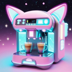kawaiitech aesthetics, scifi kawaiitech coffee machine, cat ears, at night, glowing parts, from a scifi futuristic kawaiitech world, cute pastel colors and symbols, glowing parts, ((best quality)), ((masterpiece)), ((realistic, digital art)), (hyper detailed), raytracing, volumetric lighting, Backlit, Rim Lighting, HDR, styled form, <lora:EMS-72390-EMS:1.000000>