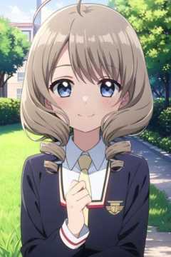 <lora:akiho_scc:0.7> masterpiece, best quality, 1girl, solo, looking at viewer, smile, blue eyes, grey hair, school uniform, ahoge, outdoors, upper body, necktie, drill hair, grass, twin drills