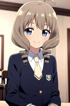 <lora:akiho_scc:0.7> masterpiece, best quality, 1girl, solo, looking at viewer, smile, blue eyes, grey hair, school uniform, ahoge, indoors, upper body, necktie, drill hair, grass, twin drills
