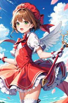 masterpiece, best quality, highres, kinomoto sakura, 1girl, brown hair, short hair, antenna hair, red headwear, green eyes, frills, red dress, puffy short sleeves, white gloves, red bow, white thighhighs, wings, <lora:kinomoto_sakura_v1:0.7>, fly, sky, holding staff, wand, fuuin no tsue, open mouth, bound, petals, cowboy shot