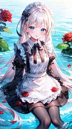 1girl, solo, long hair, maid, blonde hair, apron, pantyhose, looking at viewer, flower, dress, maid headdress, black pantyhose, maid apron, red flower, rose, sitting, long sleeves, frills, blush, bangs, water, black dress, red rose, white apron, petals, wet, twitter username, parted lips, blue eyes, frilled dress, tears