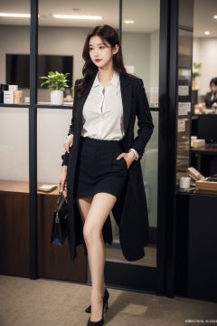 big_boobies,Spring workplace outfit, formal suit, black or gray color, simple white shirt, fitted short coat, medium-high heels, classic handbag, center-parted straight hair, wavy long hair, natural brown hair color, natural black hair color, natural base makeup, light eyeshadow and lipstick.