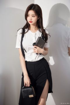 big_boobies,Spring workplace outfit, formal suit, black or gray color, simple white shirt, fitted short coat, medium-high heels, classic handbag, center-parted straight hair, wavy long hair, natural brown hair color, natural black hair color, natural base makeup, light eyeshadow and lipstick.