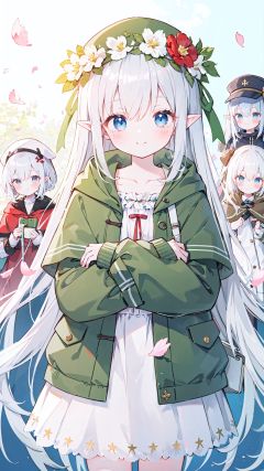 dress, white dress, 2girls, multiple girls, long sleeves, very long hair, hood down, flower, closed mouth, smile, green jacket, blue eyes, jacket, pointy ears, open clothes, long hair, hat, bangs, cabbie hat, open jacket, petals, collarbone, blush, animal hat, head wreath, red flower, capelet, white flower, sleeves past wrists, frilled dress, hood, grey hair, hooded jacket, brown eyes, white headwear, animal ears, hair between eyes, looking at viewer