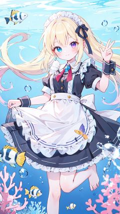 1girl, apron, dress, solo, blue eyes, long hair, bubble, underwater, white apron, frilled apron, fish, frills, blue dress, smile, short sleeves, blonde hair, wrist cuffs, bow, bangs, blush, heterochromia, air bubble, barefoot, maid headdress, closed mouth, clownfish, looking at viewer, maid apron, striped, hair between eyes, maid, striped bow, frilled dress, breasts, puffy short sleeves, purple eyes, floating hair, jewelry