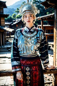 miaozu, 1girl, solo, looking at viewer, black hair, outdoors, blurry, blurry background, long sleeves, hat, chinese clothes, jewelry, lips, standing, dress, black eyes, night, red lips, closed mouth
