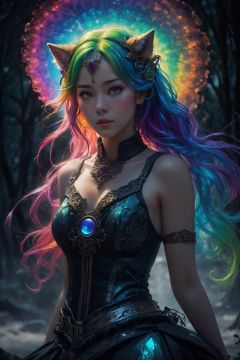 masterpiece, best quality, ultra high res, highly detailed, (psychedelic art:1.4), (woman, demon:1.3), (floating in dark mist:1.1), furry girl, anime furry women, ((best quality)), ((masterpiece)), ((realistic)), (detailed), portrait, close up, young female, RAW photo, uhd, dslr, rainbow hair, high quality, realistic, photo realistic, dreamlikeart, lens flare, upper body, looking at viewer, animal focus, furry, wolf fursuit, 1girl, cute, kawaii, lovely, fur, fur head, wolf head, narrow waist, wolf ears, black chocker, blush, paw, paw shoes, rainbow clothes, stunning gradient colors, no watermark signature, detailed background, woods, small lake with island, insanely detailed, visually stunning, wicked, hypnotic, alluring, cowboy shot, intricate, perferct shading, veil, beautiful, award-winning illustration, cosmic space background, ethereal atmosphere, ultra quality, beautiful girl, cosmical concept, rainbow strings, rainbow skin, rainbow bloody veins growing and intertwining out of the darkness, nailed wire, oozing thick blue blood, sharp neon, veins growing and pumping blood, vascular networks growing, green veins everywhere, yin and yang, glowing space, glowing stars, infinity symbol, dynamic pose, flying pose, glowing body, (rainbow aura:1.1), beautiful angel, clockwork, lightning, majestic, breathtaking