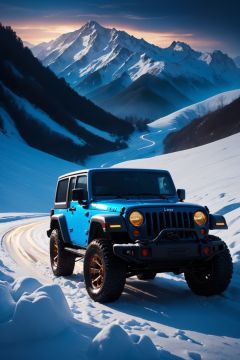 photographic of a Jeep car, snow mountain, epic photo, highly detailed, masterpiece, blue neon lights, cinematic angle, best quality, solo, bokeh, pixiv, depth of field