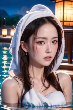 High quality, masterpiece, cinematic texture, Chinese elements, close-up of head and face, 1 girl bathing in the pool, shoulders exposed to the water surface (wrapped in a towel: 1.2), (with a large amount of water vapor on the surface: 1.5), (hot spring), lantern, night,
