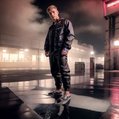 RAW photo,handsome man in dark clothes,techwear,short hair,blonde,tattoos,piercings,muscled,(parking, industrial, wet floor, red lights, volumetric, fog),
