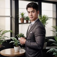 masterpiece, 1 Man, Look at me, Short hair, Tea hair, Handsome, Business suit, Black, Indoor, Coffee Shop, Potted plant, Light and shadow, The sunshine outside the window, textured skin, super detail, best quality