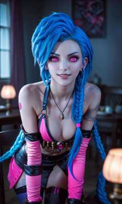 jinx (league of legends),pink eyes,<lora:MIAOKA_JINX_1.0_SDXL-000002:0.8>,blue hair,dining room