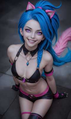 jinx (league of legends),grin,on stomach,blue hair,pink eyes,<lora:MIAOKA_JINX_1.0_SDXL-000002:0.6>,