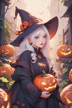 masterpiece,best quality,ultra-detailed,1girl,pumpkin,<lora:lsp-000005:0.7>,white hair,night,black witch hat,jack-o'-lantern,<lora:马卡龙:0.6>,md colorful,