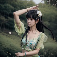 biyaoclothes, 1girl, solo, black hair, jewelry, hair ornament, bracelet, long hair, necklace, arm up, dancing, hair flower, flower, holding, upper body, breasts, small bells is tied to the wrist, blurry, cast spells, two small bells, medium breasts, collarbone, cowboy shot, outdoors, biyaoclothes, <lora:biyaoclothes08:0.9>