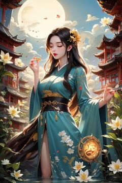 Fengjing1,1girl,architecture,artist name, ball, bird, bridge, camellia, circle, closed eyes, cloudiest asian architecture,egasumi,fish,floral print, flower, fox mask, full moon,goldfish,leaf,lily\(flower\),lily paddling hair, long sleeves,lotus,mask,moon,pagoda,paper lantern, sun,torii,traditional media, umbrella, very long hair, water, waves, white flower