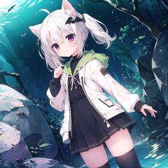 1girl, flat chest, short hair, white hair, ahoge, messy hair, payot, twintails, short twintails, animal ears, animal ear fluff, bat ears, bangs, hair between eyes, bat hair ornament, seductive smile, empty eyes, red eyes, glowing eyes, black dress, short dress, pleated skirt, hooded jacket, white jacket, open jacket, open clothes, white hood, hood down, long sleeves, wide sleeves, sleeves past wrists, sleeves past fingers, white thighhighs, zettai ryouiki, boots, white footwear, cave, damp, dark, geology, limestone, nature, rocks, subterranean, underground, water, wet, murky water, stalactites and stalagmites, masterpiece, best quality, official art, extremely detailed CG unity 8k wallpaper, artbook, yuzu-soft, kobuichi, muririn,