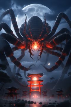 Hyperrealistic art BJ_Sacred_beast,Spider,outdoors,horns,sky,teeth,cloud,tree,no_humans,night,glowing,moon,cloudy_sky,fire,night_sky,scenery,glowing_eyes,full_moon,monster,torii,architecture,east_asian_architecture,shrine,fog,masterpiece,best quality,masterpiece,best quality,official art,extremely detailed CG unity 8k wallpaper,landscape/scenery,absurdres,<lora:SDXL_Sacred_beast_V2.3:0.7>, . Extremely high-resolution details, photographic, realism pushed to extreme, fine texture, incredibly lifelike
