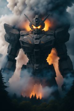 Hyperrealistic art BJ_Sacred_beast,gundam,solo,outdoors,sky,cloud,tree,no_humans,glowing,fire,robot,mecha,glowing_eyes,smoke,science_fiction,cinematic lighting,strong contrast,high level of detail,Best quality,masterpiece,Extremely high-resolution details,photographic,realism pushed to extreme,fine texture,incredibly lifelike ,<lora:SDXL_Sacred_beast_V2.3:0.7>, . Extremely high-resolution details, photographic, realism pushed to extreme, fine texture, incredibly lifelike