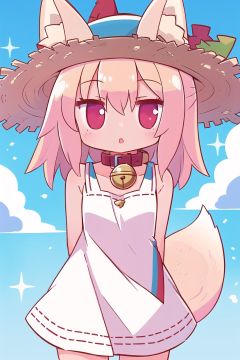 1girl, solo, bell, dress, animal ears, tail, blonde hair, hat, straw hat, fox tail, fox ears, collar, white dress, neck bell, sky, brown collar, kemomimi-chan \(naga u\), arms behind back, cloud, hair between eyes, parted lips, bangs, day, looking at viewer, blue sky, sleeveless dress, jingle bell, fox girl, red eyes, blush, animal ear fluff, ears through headwear, sleeveless, bare shoulders, long hair, bow, sundress, outdoors, :o, sun hat, collarbone, brown headwear, red collar