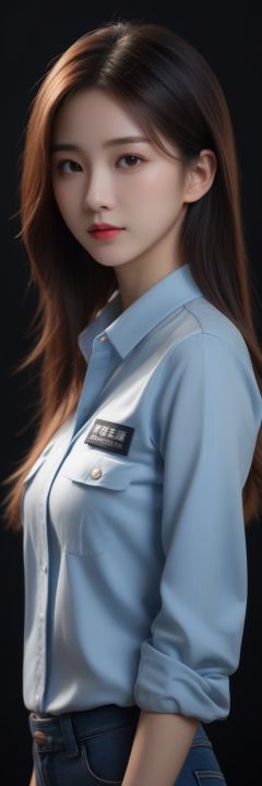 masterpiece, best quality, official art, extremely detailed CG unity 8k wallpaper, exposure blend, medium shot, bokeh, (hdr:1.4), high contrast, (cinematic), (muted colors, dim colors, soothing tones:1.3), natural external halo, excellent color and light effects, (color deviation, color deviation, color reproduction: 1.1) , 1 chinese girl, ((full_body)), Stand, Black background,long hair,wearing a security shirt,blue_jeans