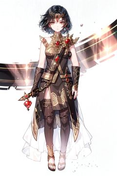 (masterpiece:1.3),(the best quality:1.2),(super fine illustrations:1.2),(Masterpiece),high quality,high detail,(white background:1.2),looking at viewer,(SOLO:1.4),outline,simple background,,circlet,gem,hair ornament,holding weapon,red eyes,weapon,short hair,sleeveless,black hair,1girl,solo,