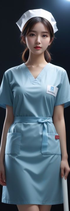 masterpiece, best quality, official art, extremely detailed CG unity 8k wallpaper, exposure blend, medium shot, bokeh, (hdr:1.4), high contrast, (cinematic), (muted colors, dim colors, soothing tones:1.3), natural external halo, excellent color and light effects, (color deviation, color deviation, color reproduction: 1.1) , 1 chinese girl, ((full_body)), Stand, Black background,Bundled hair, leg,wearing a surgical scrubs,skirt,nurse cap
